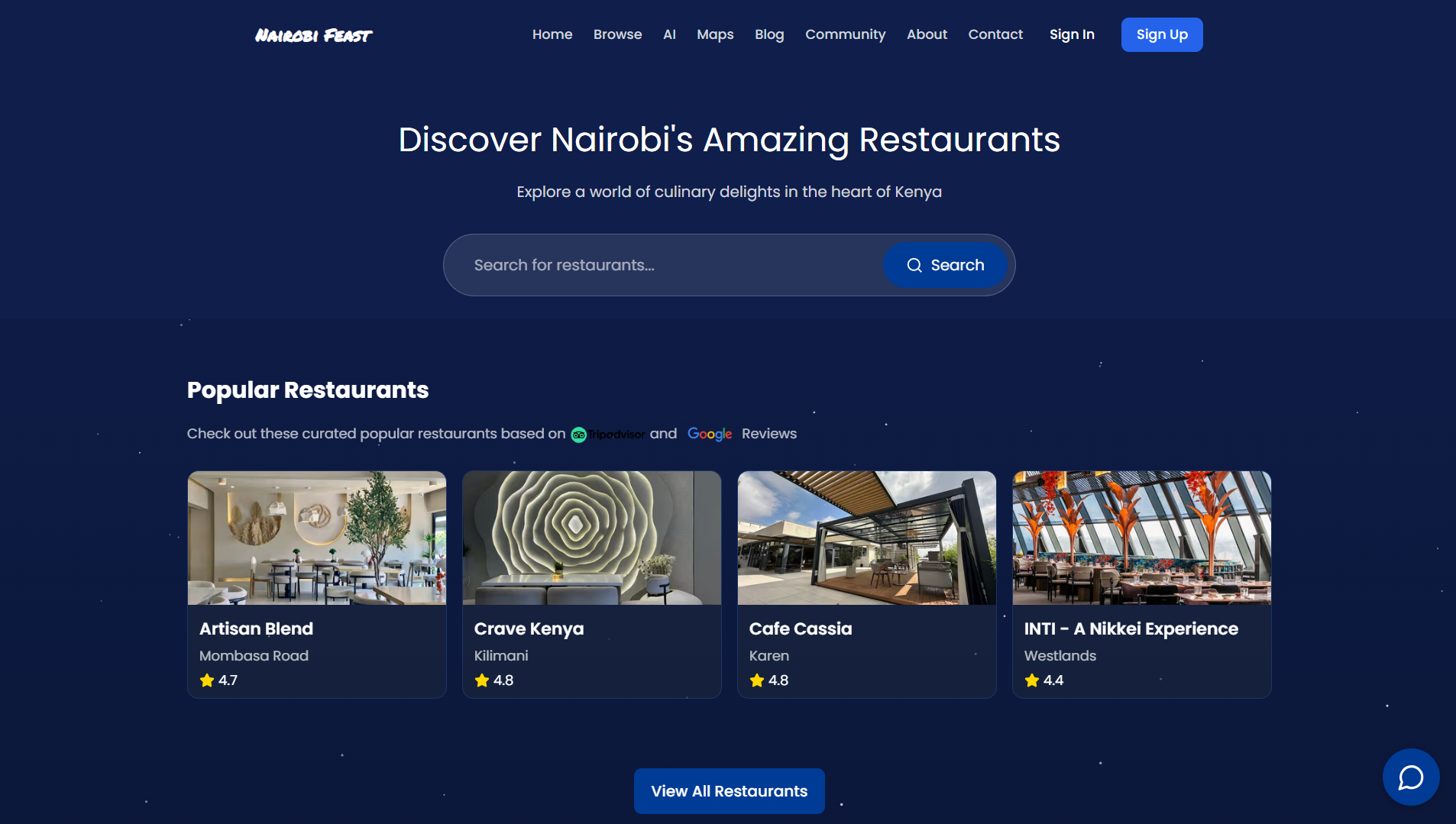 Nairobi Feast is a restaurant discovery platform built to help food lovers explore standout dining experiences across Nairobi through a fast, polished, and highly visual digital product.